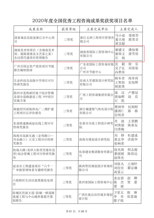 2021年3月5日,中國工程咨詢協會公布了“2020年度全國優秀工程咨詢成果獎獲獎名單”的通知。省咨詢公司有3項工程咨詢成果榮獲國家優秀工程咨詢成果獎,其中投融資與戰略咨詢部完成的《湖南現代農業集團發展戰略規劃(2020—2024)》榮獲國家優秀工程咨詢成果獎二等獎,生態規劃咨詢部完成的《湖南省洞庭湖水環境綜合治理專題研究報告》、建設工程管理咨詢部完成的《湖南美術館項目(含湖南美術館、展陳裝修及文藝家之家)全過程代建項目管理報告》榮獲國家優秀工程咨詢成果獎三等獎。