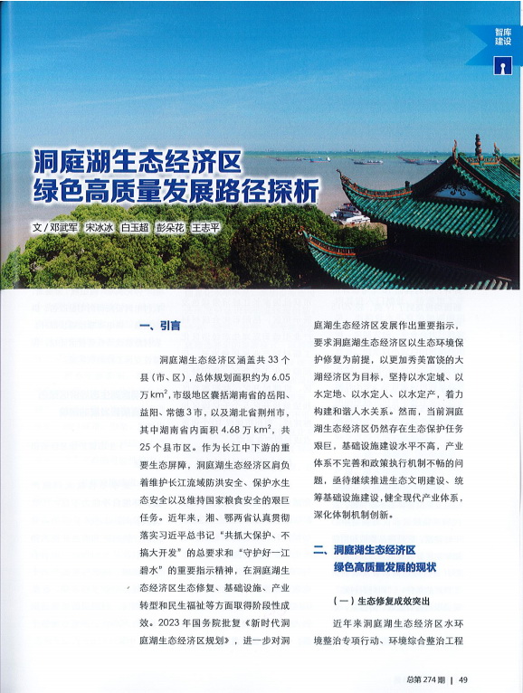 近年來,湘、鄂兩省在洞庭湖生態經濟區生態修復、基礎設施、產業轉型和民生福祉等方面取得階段性成效。2023年2月國務院批復《新時代洞庭湖生態經濟區規劃》,進一步對洞庭湖生態經濟區發展作出重要指示。然而,當前洞庭湖生態經濟區仍然存在生態保護任務艱巨,基礎設施建設水平不高,產業體系不完善和政策執行機制不暢的問題。本文在精準分析洞庭湖生態經濟區發展困境的基礎上,從生態文明、基礎設施、產業發展、政策保障等方面探析洞庭湖生態經濟區綠色高質量發展路徑。